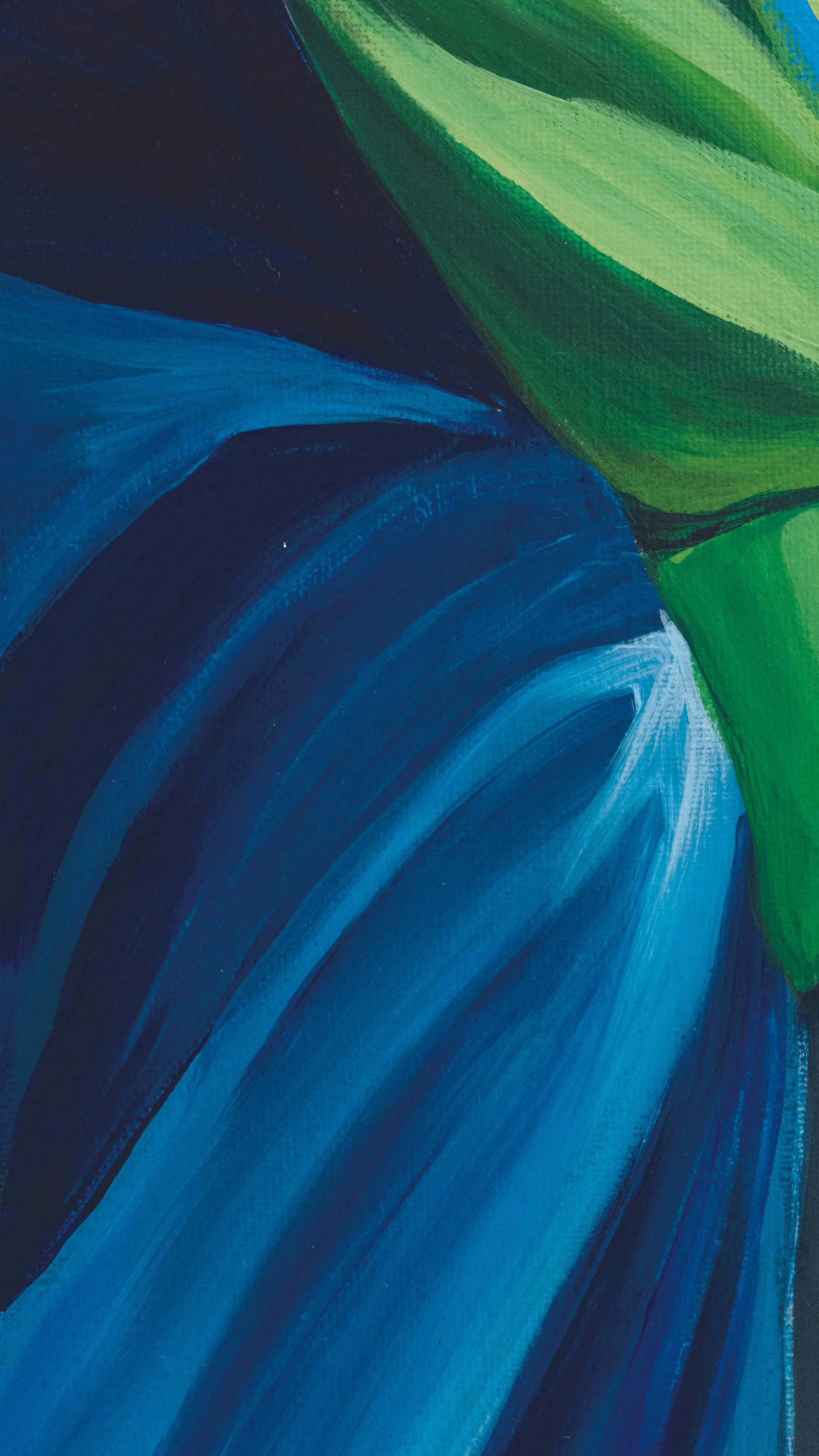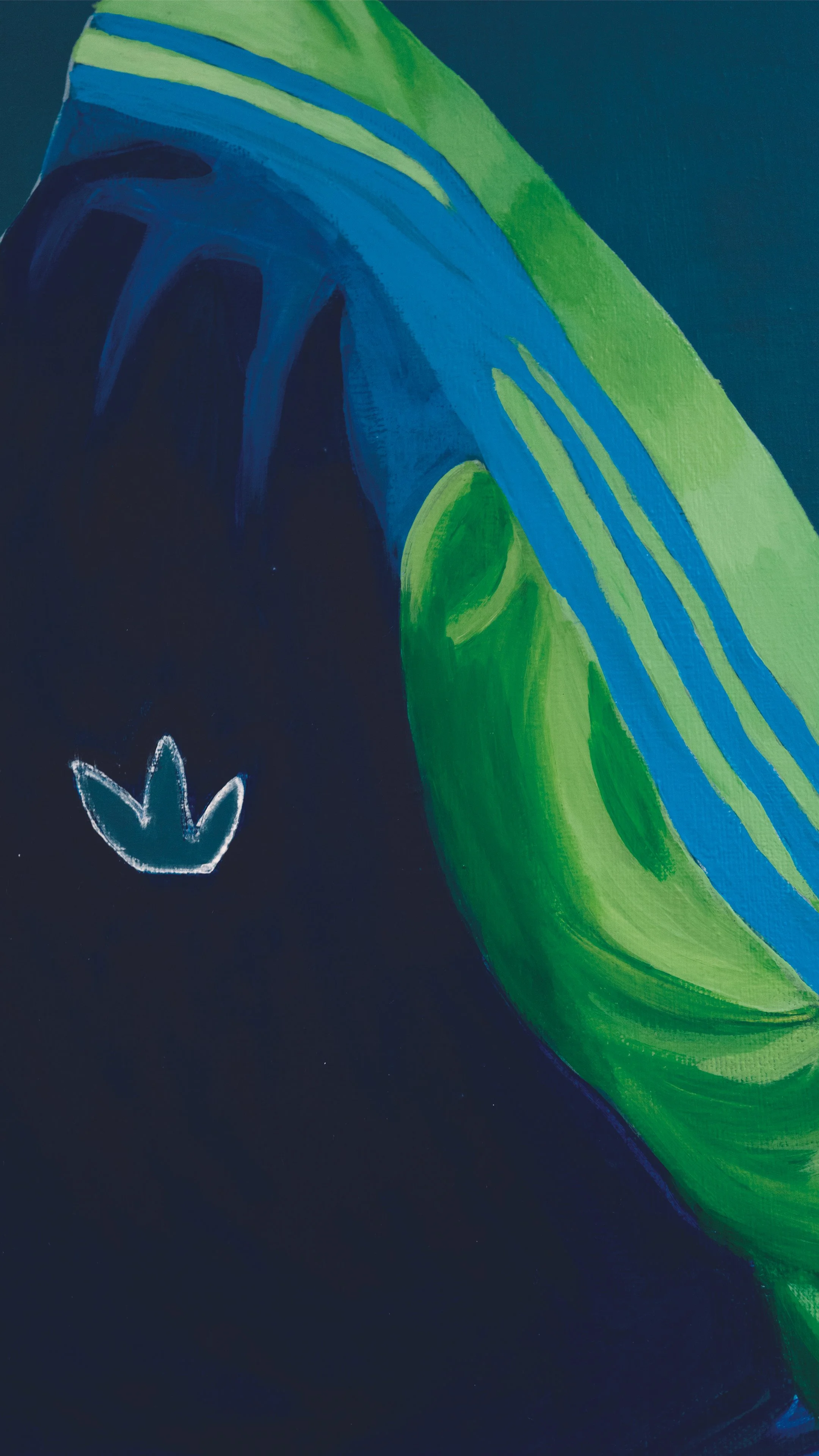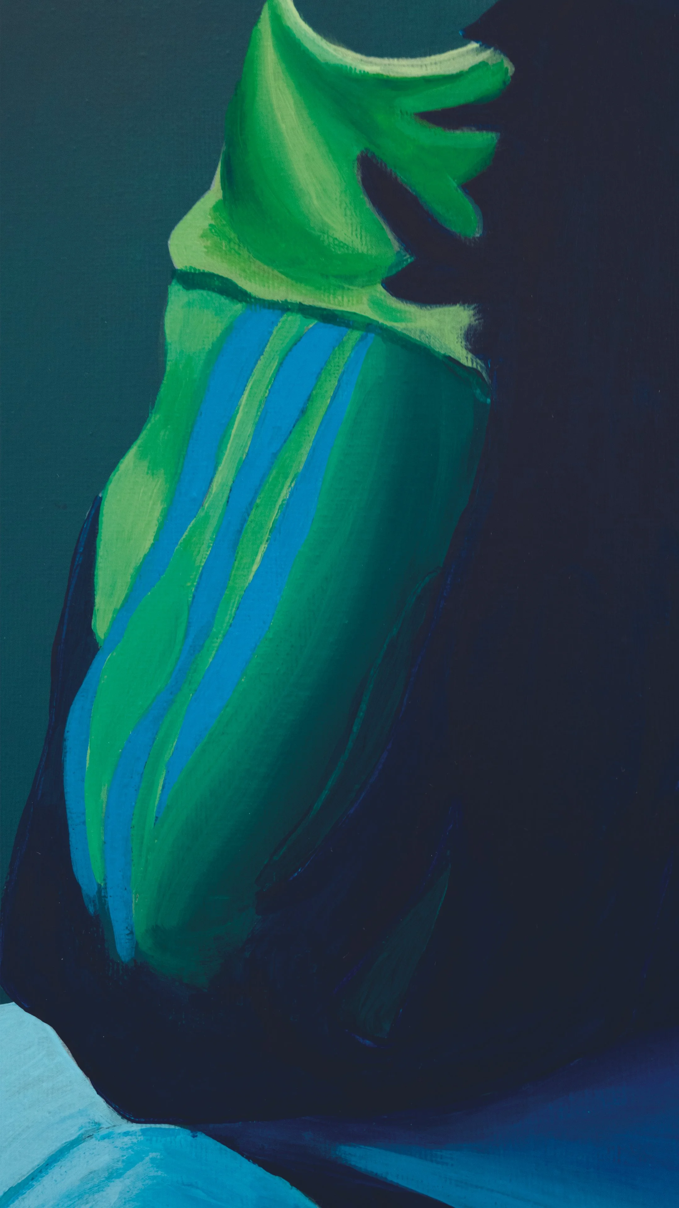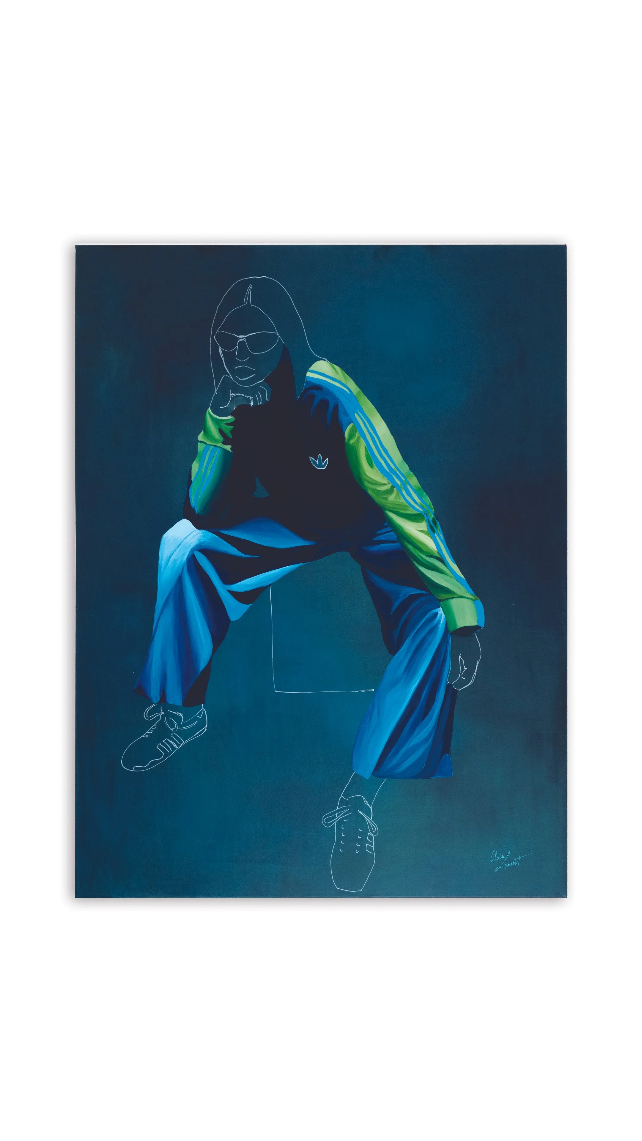 In Anonymous Attitude, Claire Laurent portrays a seated figure dressed in a sports tracksuit, captured in a relaxed yet assertive pose. The simplified contours and the absence of facial detail direct the gaze toward the clothing and body language. The viewer is drawn to the interplay of blues and greens that structure the figure and define the spatial rhythm of the composition.