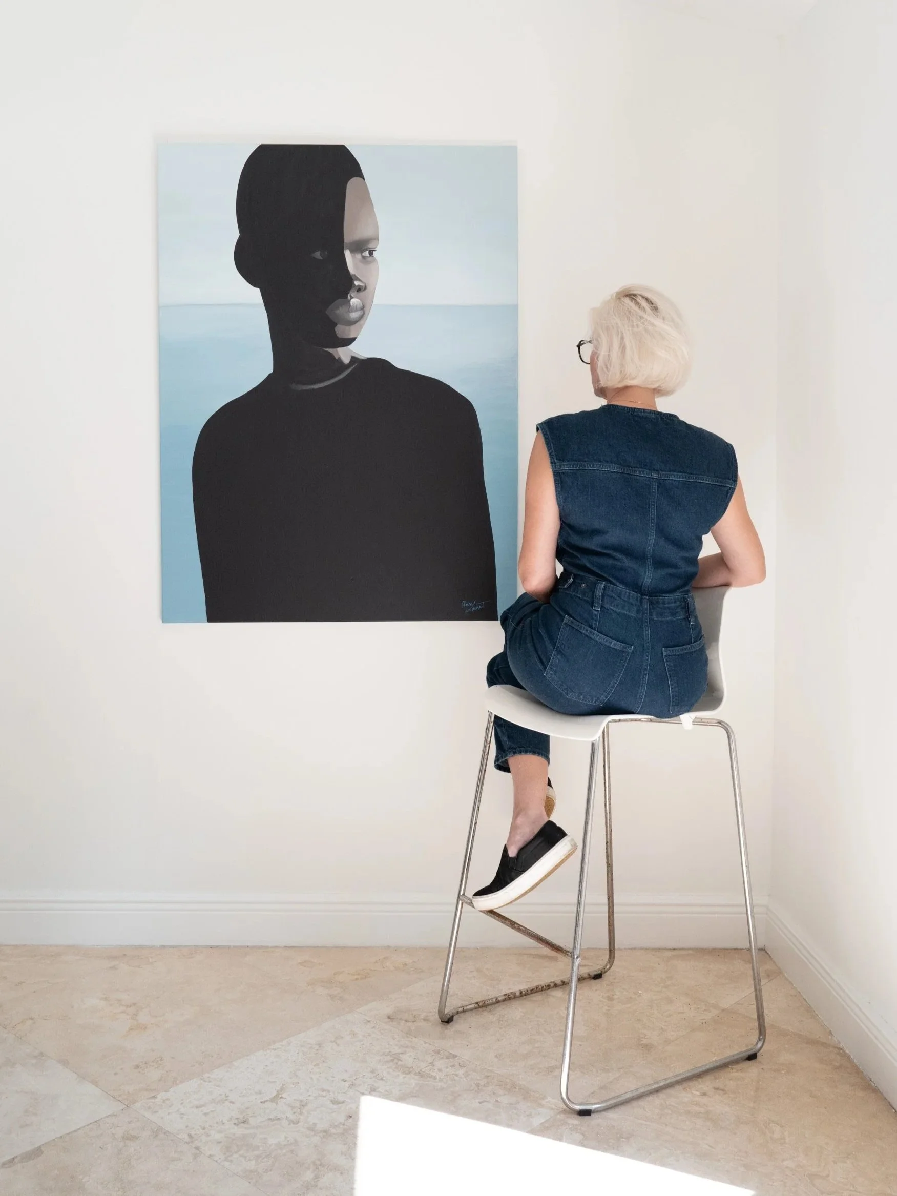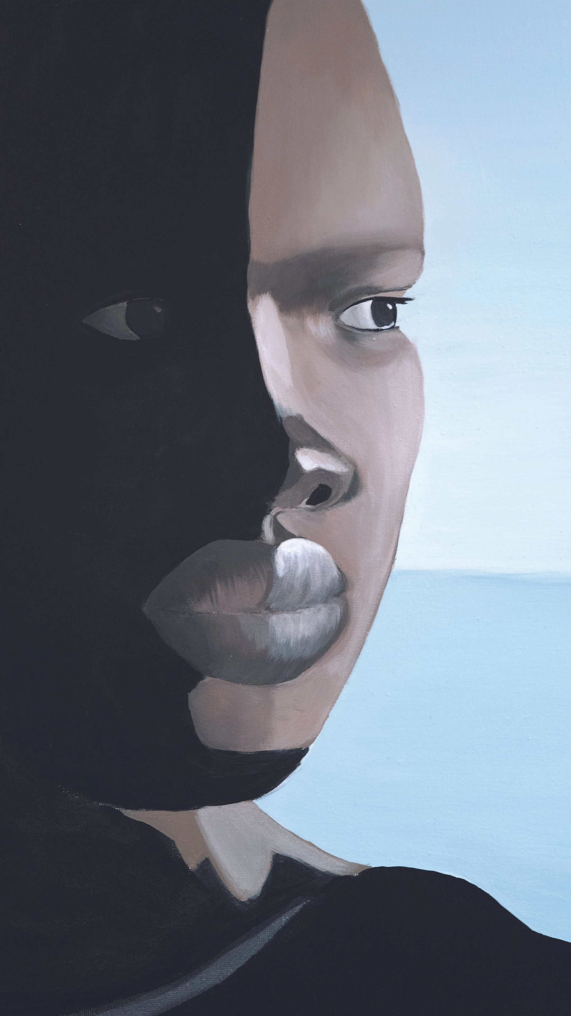Through minimal color and precise geometry, Claire Laurent explores how light, scale, and framing construct a visual identity that is both human and symbolic. The painting reflects her ongoing interest in the relationship between form, silence, and contemporary portraiture.