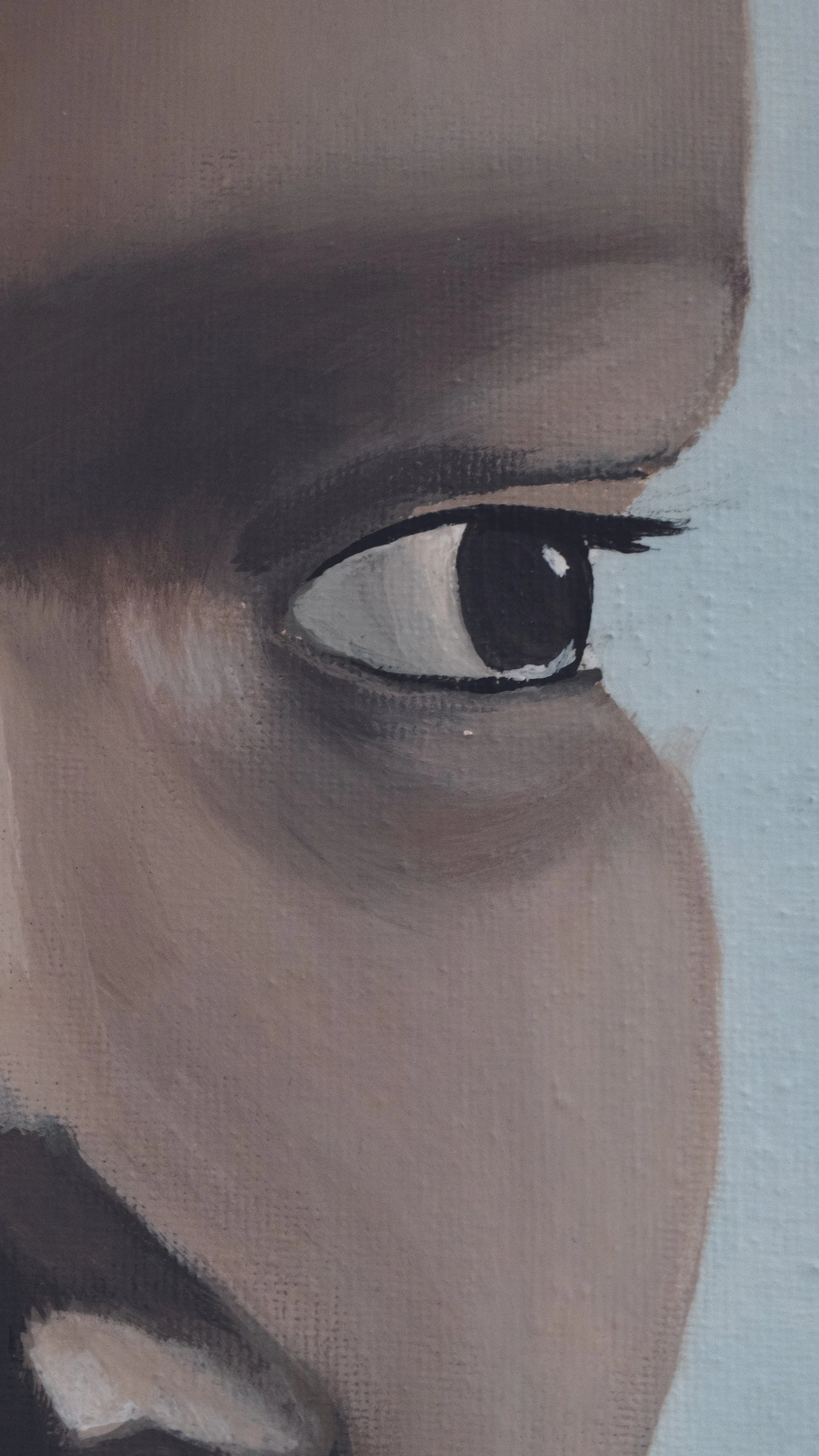 The division of the face into areas of light and shadow introduces a sculptural dimension, reinforcing the sense of solidity and stillness. The figure appears almost monolithic, like a totem of presence, occupying space with quiet intensity.