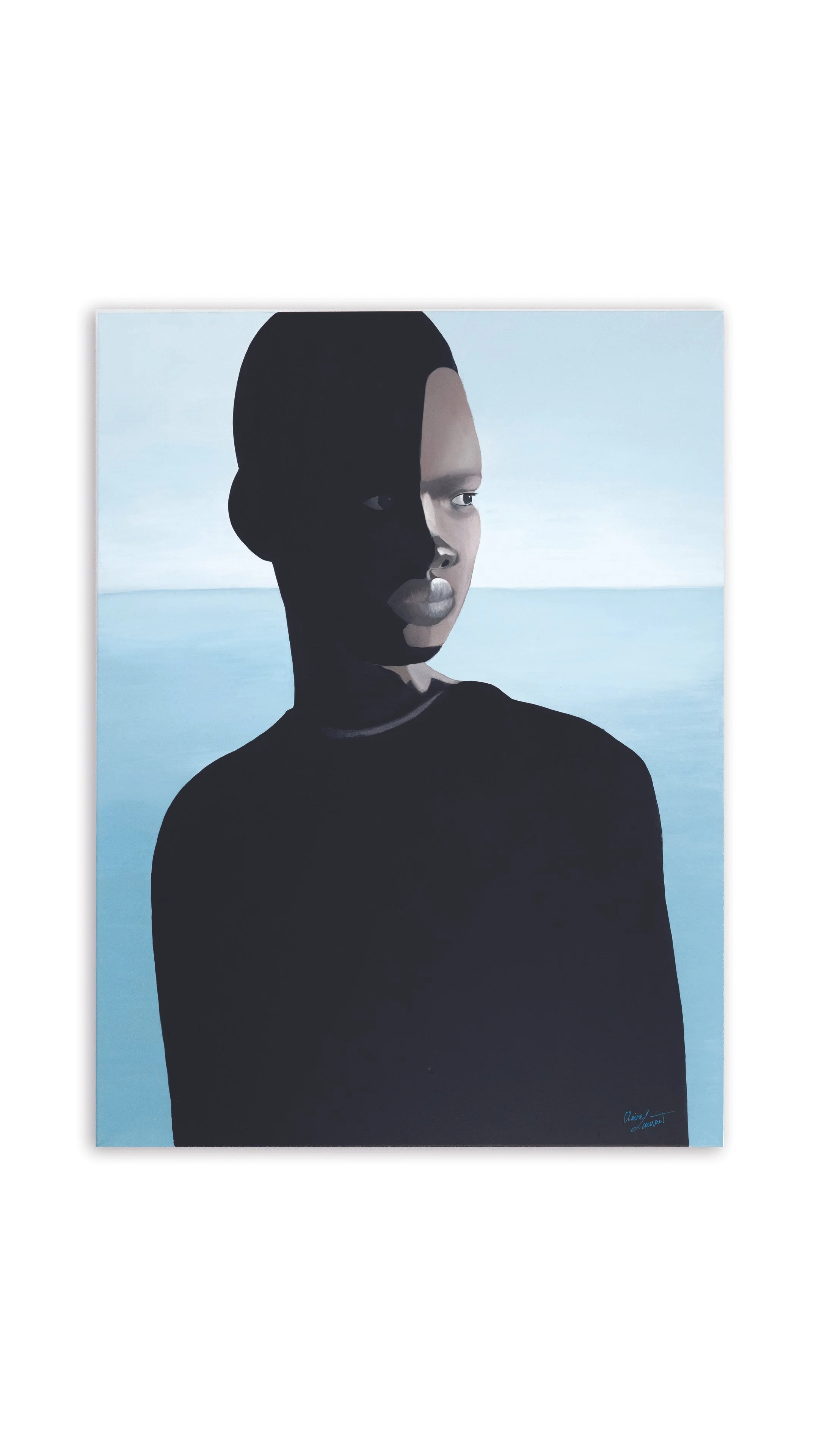 In Monolith Gaze, Claire Laurent presents a frontal portrait that combines simplicity of form with strong spatial tension. The figure stands against a reduced horizon where sea and sky merge, creating a calm but charged atmosphere.
